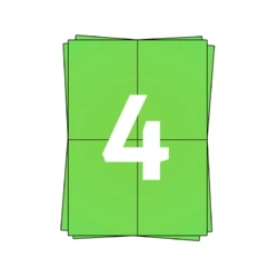 Las hojas verdes de pegatinas A4 contienen 4 etiquetas A6 por hoja. Las etiquetas autoadhesivas A6 tienen un adhesivo permanente y están hechas de papel decolorado sin cloro, por lo que se pueden pegar en diferentes superficies como papel, cartón y lámina. Las etiquetas A6 son aptas para todas las impresoras de chorro de tinta y láser, así como para dispositivos offset y copiadoras. Una caja contiene 100 hojas de etiquetas A4. Así que hay 400 etiquetas A6 de color verde. Las etiquetas A6 105x148mm se utilizan a menudo como etiquetas de envío para DPD, Correos España, TNT, GLS y UPS. Debido a su tamaño, también se denominan pegatinas A6, etiquetas A6.