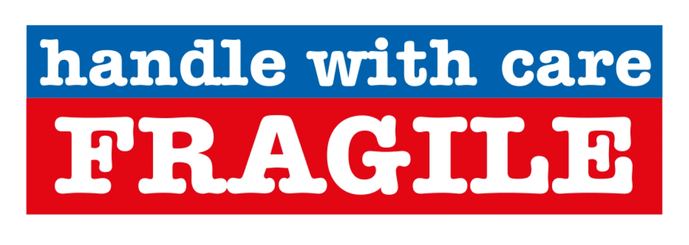 Una de nuestras etiquetas de advertencia es la etiqueta 'Handle with care' (Frágil - Manejar con cuidado). Esta etiqueta está hecha de papel grueso de color blanco brillante y tiene un adhesivo permanente.